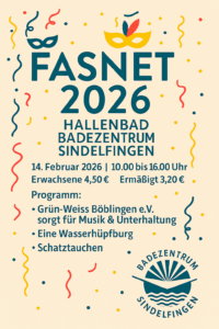 Liebe Badegäste, am Samstag, den 07.02.2026 bleibt das Badezentrum Sindelfingen aufgrund einer internen Veranstaltung ganztägig geschlossen. Wir freuen uns, Sie ab Sonntag, den 08.02.2026, wieder